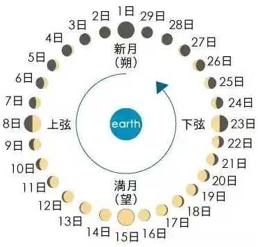 朔日、望日、晦日、弦日是农历中描述月亮形态变化的四个关键节点,分别对应不同日期及月相特征,共同构成农历月相变化的完整循环。月相变化的背后是月亮、地球与太阳三者位置的天文规律, “朔、望、晦、弦”月相变化周期循环,每个循环规定为农历月份的一个月,也就是月相从“亏”到“盈”再从“盈”到“亏”的一个完整过程。