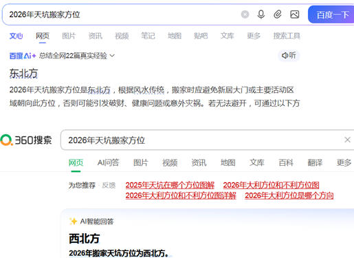 打开电脑,分别用百度与360两个搜索引擎搜索2026年天坑方位,搜索结果见截图。百度搜索结果显示东北方天坑方位,360搜索结果显示西北方天坑方位,明显有一个结果是错误的。