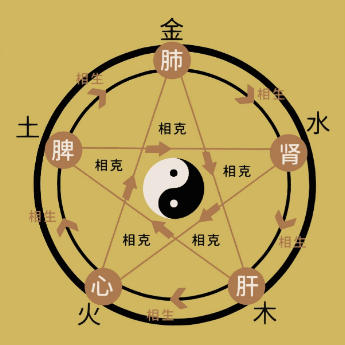 五脏对应的五行是:肝属木、心属火,肺属金,脾属土,肾属水。人有五形:喜、怒、悲、忧、恐,这些情志活动受五行生克关系的调节。心生喜,肝生怒,脾生忧,肺生悲,肾生恐,依五行循环产生相生相克,制化变化规律与人整体脏腑循环。