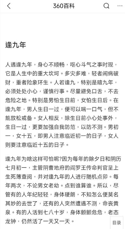 逢九年分为明九年和暗九年。明九年指本人虚岁年龄出现数字九:即9岁、19岁、29岁、39岁、49岁等。暗九年指本人虚岁年龄以九的倍数出现:即9岁、18岁、27岁、36岁、45岁等。逢九必衰、逢九必凶,这是长期以来人们对逢九年做出的总结,下面是360百科介绍“逢九年”的截图,人遇逢九年,身心不顺畅,流年运势起伏比较大。